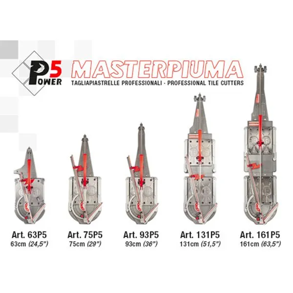 The Range of Masterpiuma Power 5 super-professional tile cutters includes models 63P5 (cm 63×63), 75P5 (cm75x75) and 93P5 (cm 93×93) and the brand new 131P5 (cm 131×131) and 161P5 (cm 161×161) are added to better accommodate the latest trends in ceramic tiles.